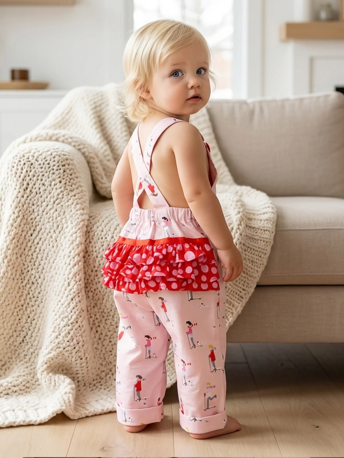 Sew adorable handmade outfits with this baby overall sewing pattern. The Chelsea Romper features adjustable shoulder straps, an elasticized back, and optional ruffle details, creating a comfortable and stylish outfit for babies and toddlers.