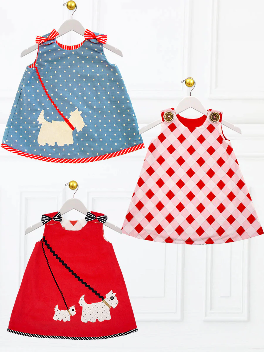 The Scottie dress and top are an easy to make reversible dress and top with a cute Scottie Dog appliqué. This will no doubt become your little girl's favorite. You have multiple sizes of Scottie dogs to choose from so you can mix and match and make your dress or top truly unique. Don't worry if you're not confident with making buttonholes as I also give you the option of putting velcro under the shoulder tabs with a cute bow on top.